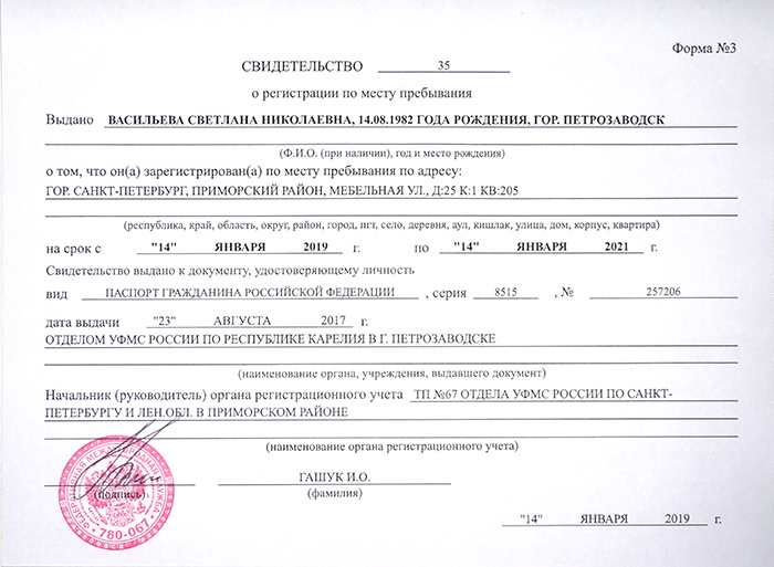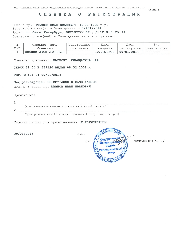 Образец временной регистрации