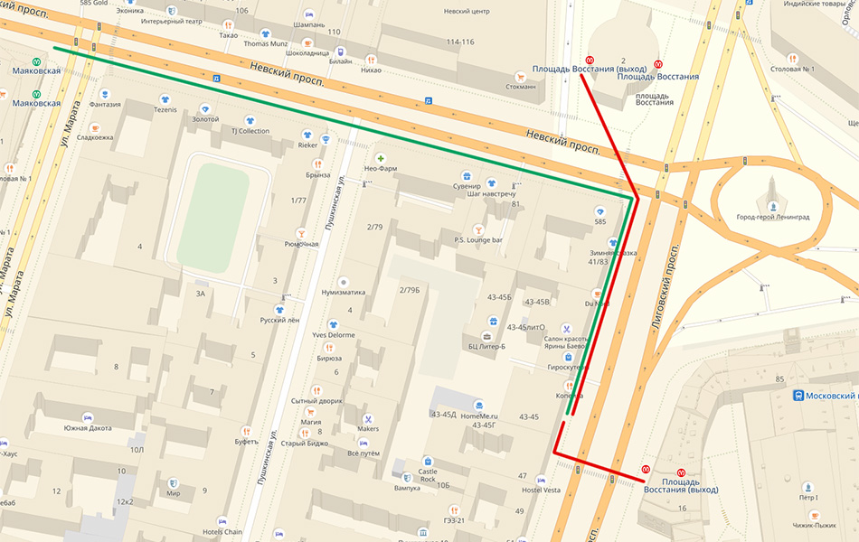 – от м. Пл.Восстания (Выход на Невский пр.) – перейти Невский пр. и пройти 100 метров по Лиговскому пр.